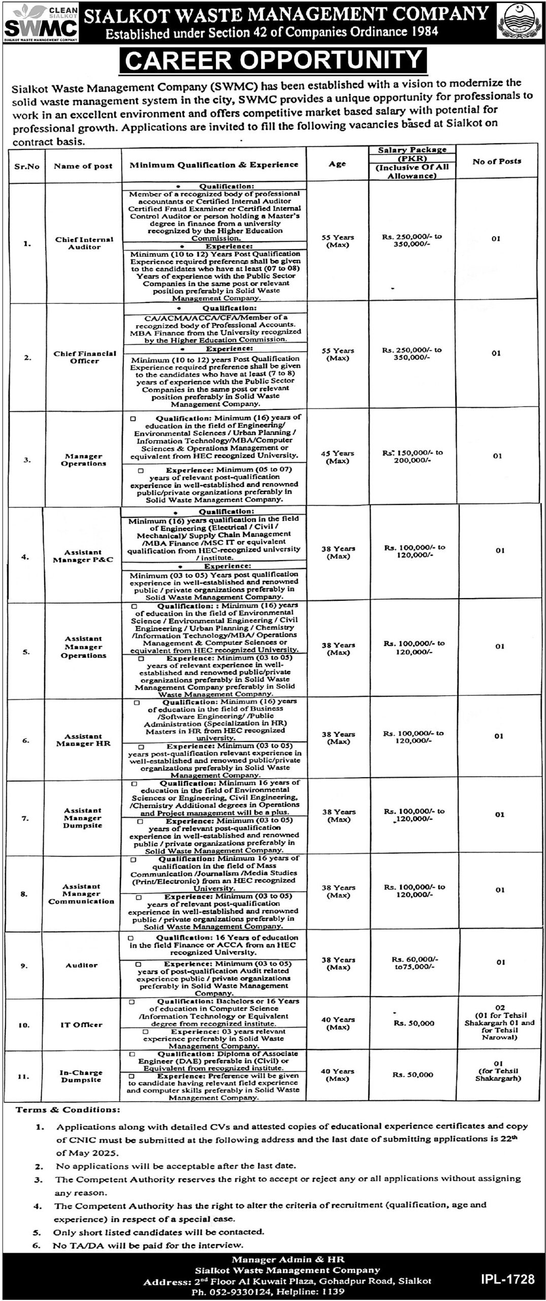 Date Posted / Updated: 07 May, 2025 Category / Sector: Government Education: Bachelor, Master, MS, or BS Job Type: Full Time Job Industry: Management Jobs Location: Sialkot Other Area Jobs, Sialkot, Punjab, Pakistan Organization: Sialkot Waste Management Company (SWMC) Expected Last Date to Apply: 22 May, 2025 or as told in the newspaper ad Online Applicants: Be among the first 25 people to apply
